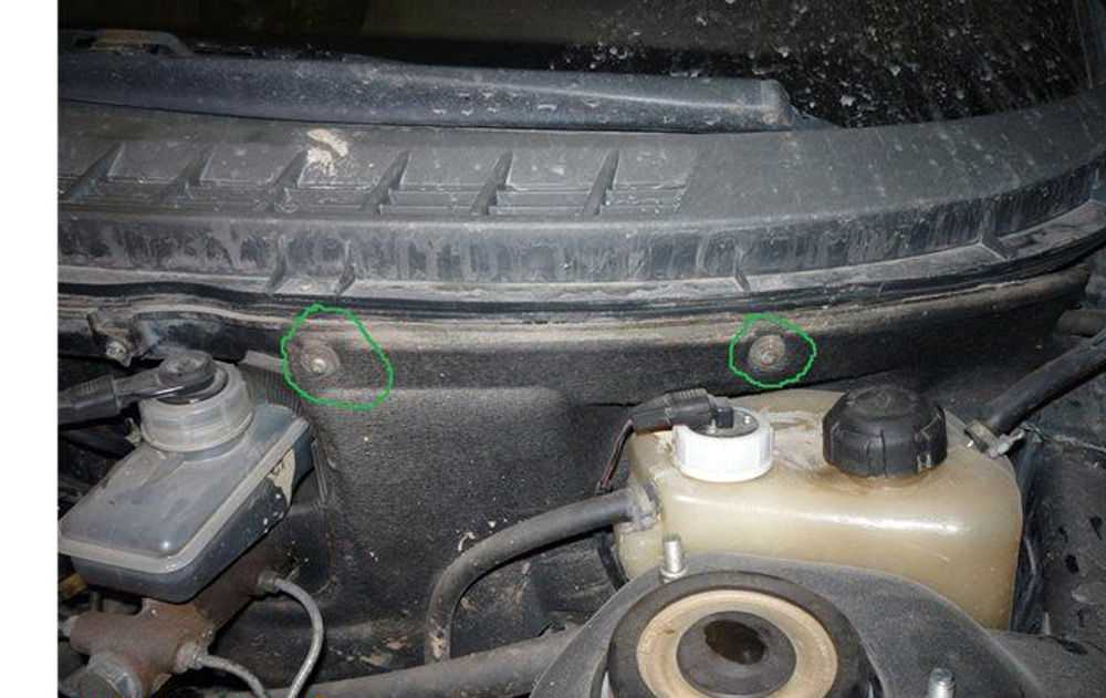 - Далее выкручиваем винты, которыми к корпусу перед ветровым стеклом прикреплены решетки воздухопритока. Снимаем их;
