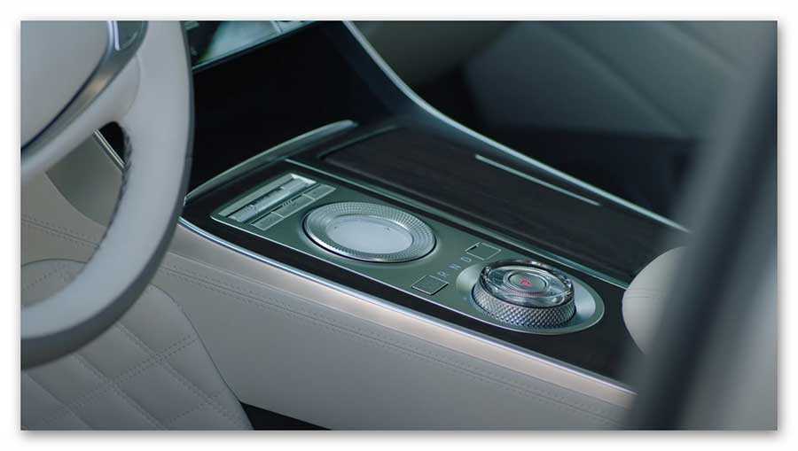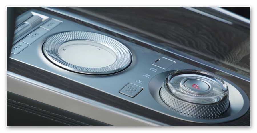 - широкую и красиво оформленную переднюю консоль с поворотными шайбами климат-контроля, переключения режимов движения («Спорт», «Комфорт», «Эко», «Кастом»). Управление КПП также осуществляется посредством аналогичного «кругляша», заменяющего привычный всем рычаг-селектор.