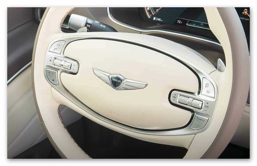 В базовом варианте GV70 оснащается двухспицевым мультифункциональным рулем с кожаной отделкой, спортивная и максимальная комплектации получают трехспицевое рулевое колесо.