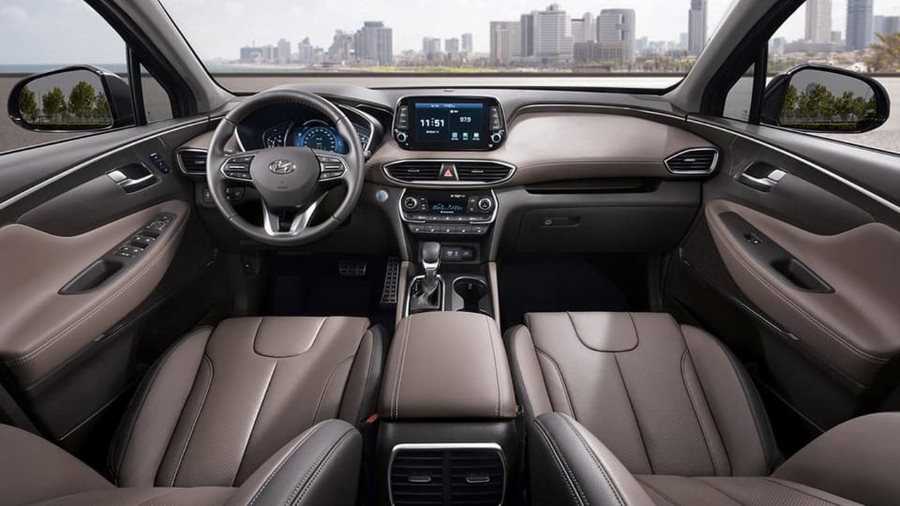 Интерьер Hyundai Santa Fe нового поколения отличается совершенно новой консолью и фронтальной панелью. Панель выполнена в современном стиле и выглядит достаточно дорого. На опубликованных фотографиях салона можно увидеть одну из топовых комплектаций Хендай Санта Фе 2018-2019 года, о чем свидетельствуют виртуальный приборный щиток, многофункциональный руль, современный комплекс мультимедиа с сенсорным цветным дисплеем (Android Auto, Apple CarPlay, голосовые команды и т.д.). Под экраном расположены вентиляционные дефлекторы, а ещё ниже находятся элементы управления двухзонным климат-контролем. Также интерьер кроссовера получил кожаные кресла, причем передние сиденья оснащаются подогревом, электрическими регулировками и системой вентиляции.