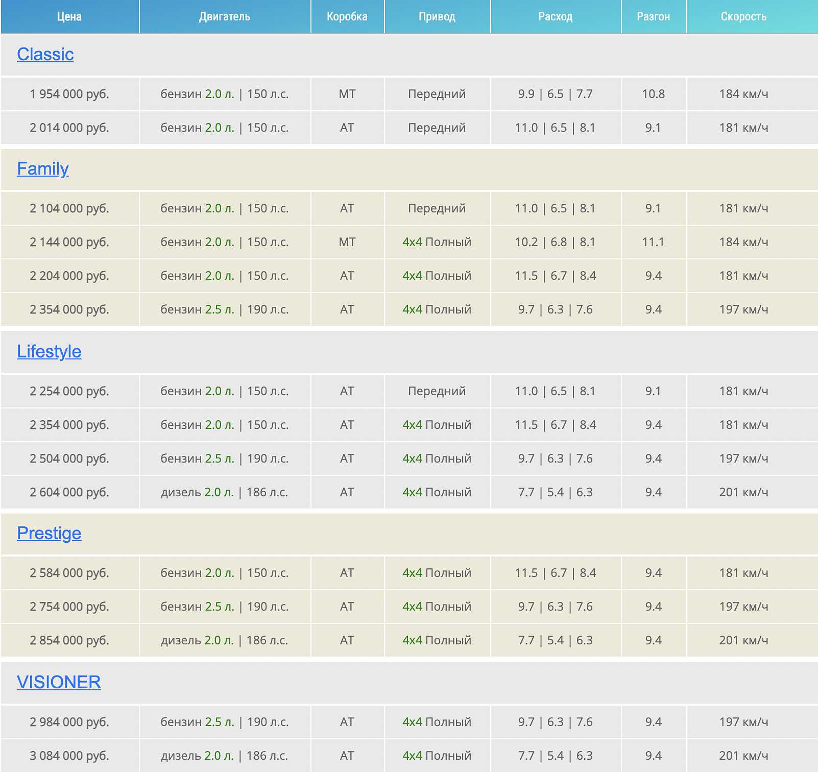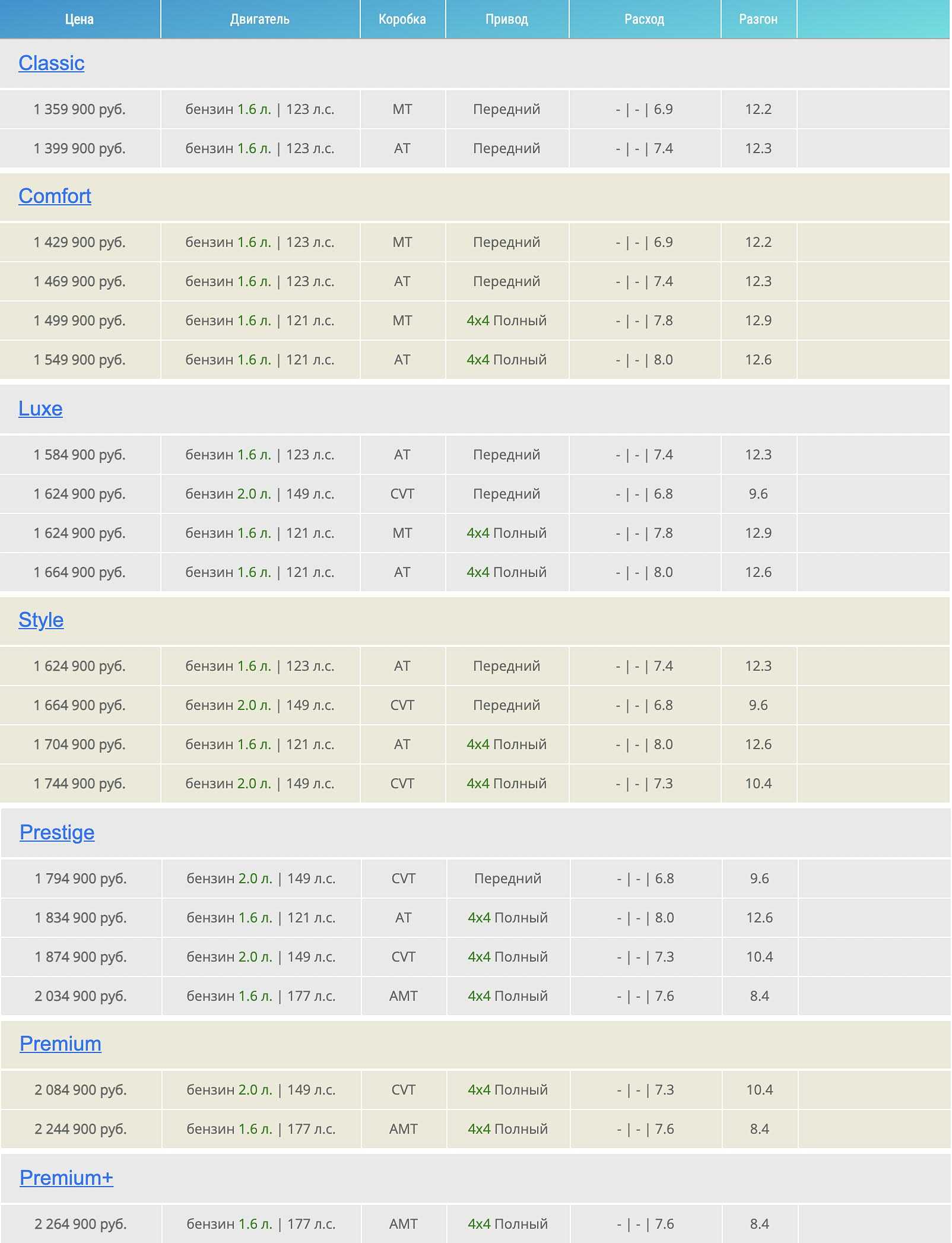 | Комплектация | Цена | Двигатель | Коробка | Привод |