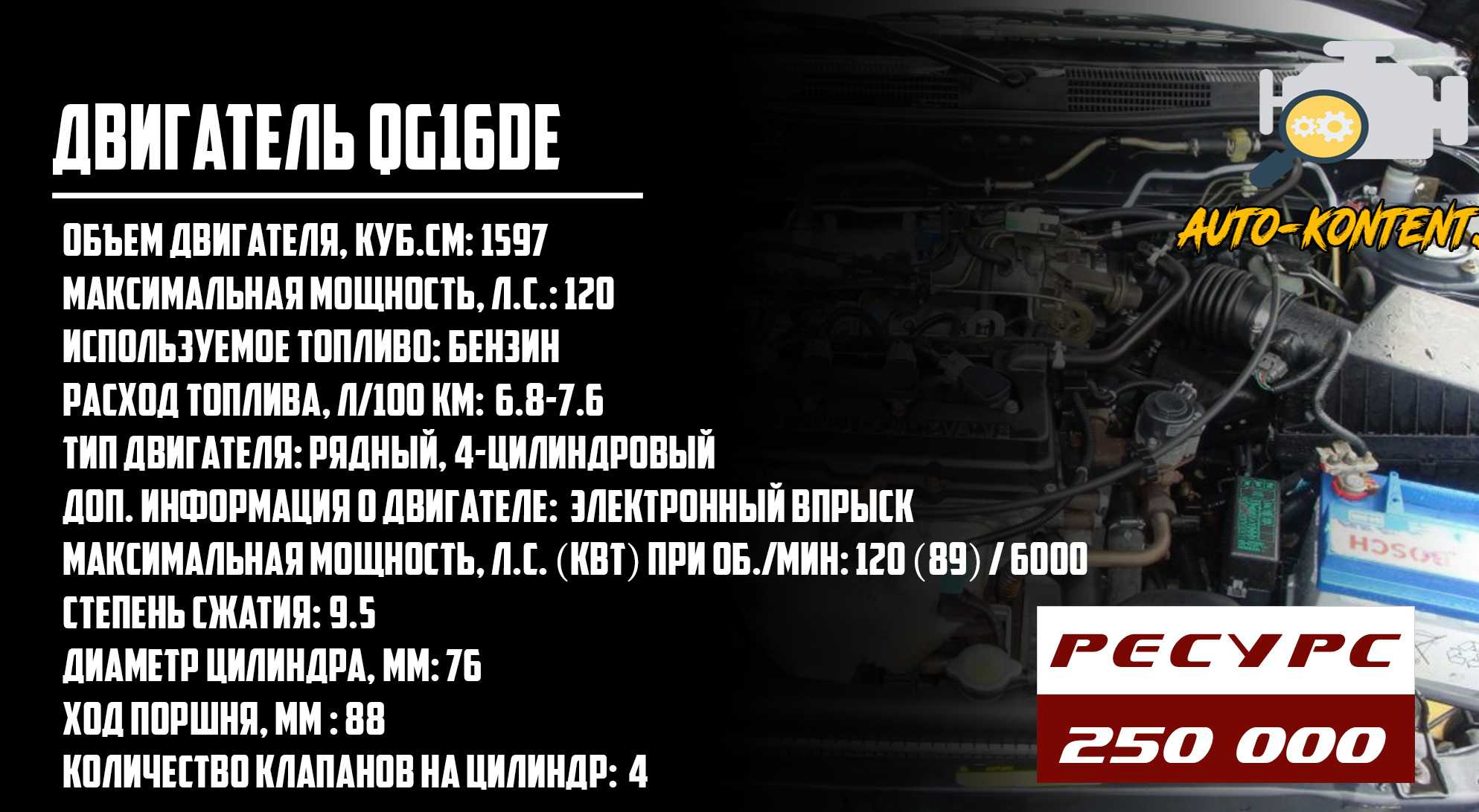 Разработкой этого двигателя занимались специалисты из Aichi Machine Industry. В моторе QG16DE видели достойную альтернативу и замену для двигателя GA16DE. В результате получился довольно простой 1.6-литровый мотор с распределенным впрыском топлива, чугунным блоком цилиндров и алюминиевой 16-клапанной головкой блока цилиндров. С рядной 4-цилиндровой конструкции удалось снять мощность в 120 лошадиных сил, что вполне хороший показатель, но по ряду причин для отечественных автолюбителей движок «задушили» до 110 сил. Газораспределительный механизм с приводом от цепи.