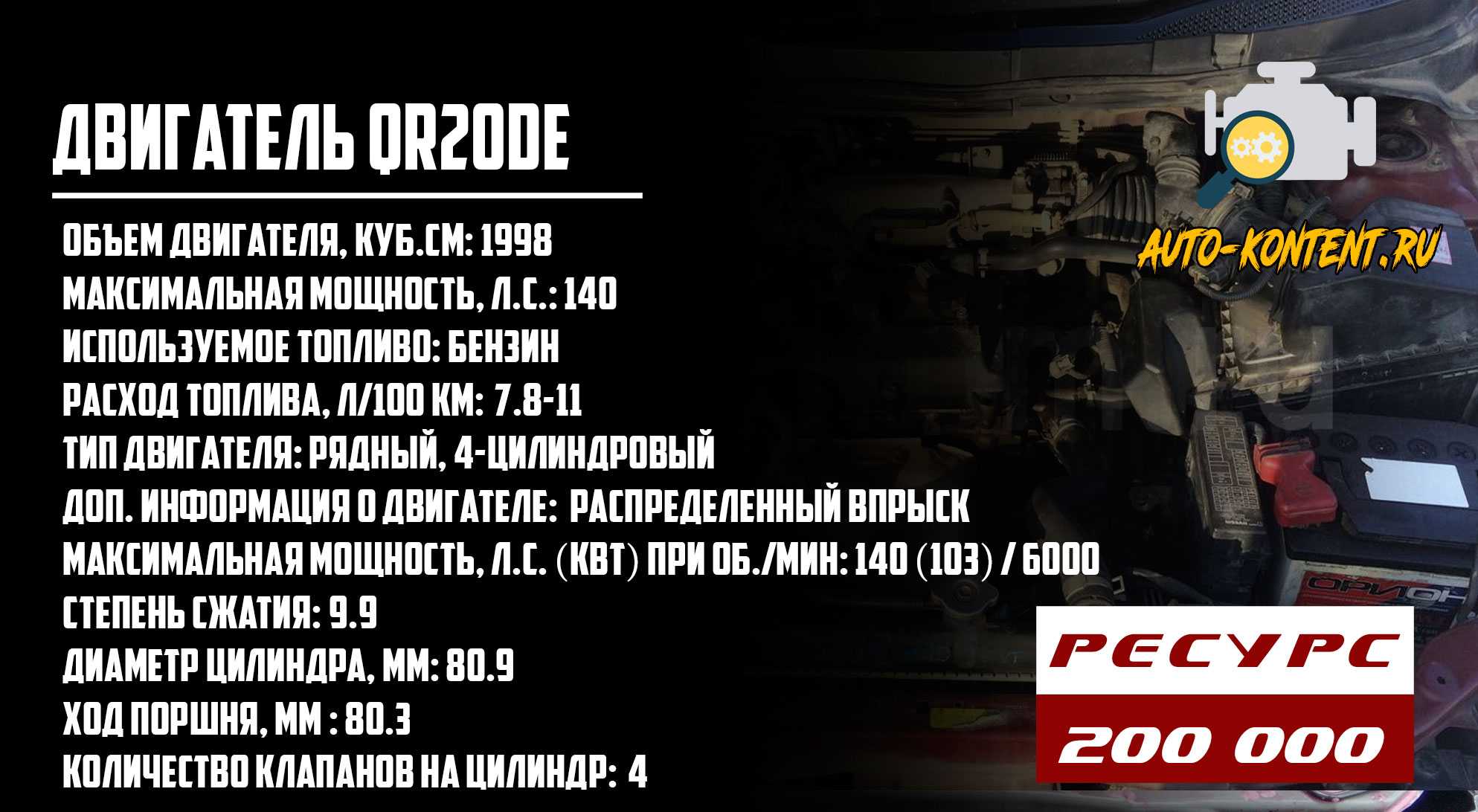 - QR20DE – двухлитровый мотор на 2.0 литра мощностью 140 лошадиных сил;