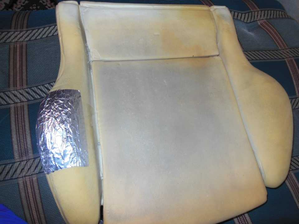 Купил обыкновенную губку. Советую брать ту, что по жестче . Вырезал необходимый мне кусочек, приложил к поролону и заклеил это всё металлизированной лентой. Она оказалась под рукой. И она. кстати, обладает очень клейкими свойствами, так же не пропускает влагу и хорошо приобретает форму сиденья. Вот так у меня это получилось: