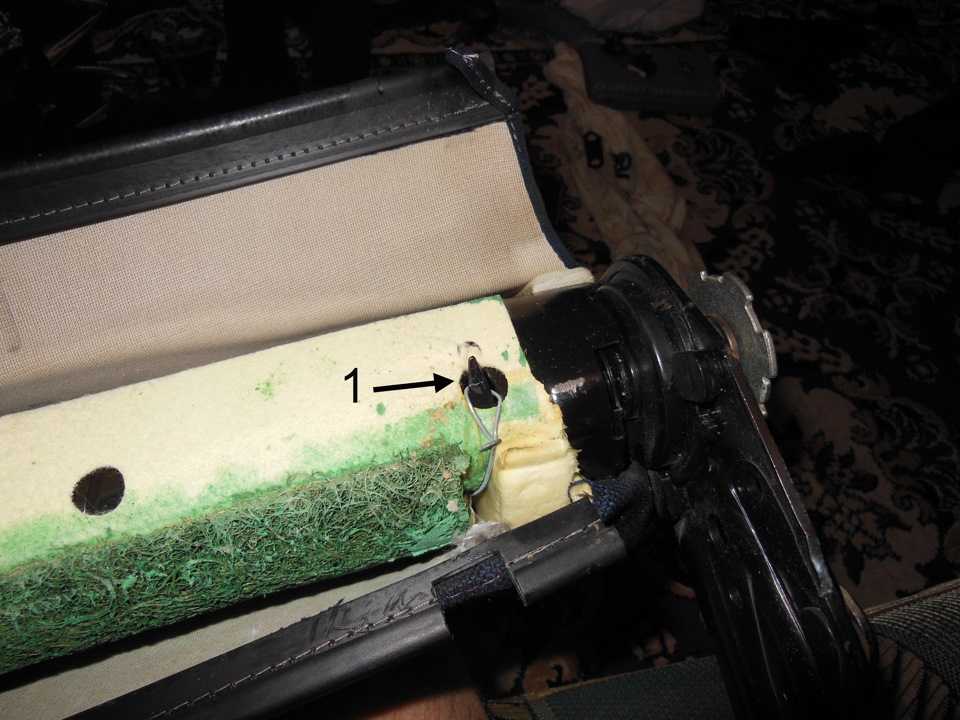 1. В Нижней части спинки снимаем с зацепов 1 проволоку натяжения чехла (с обеих сторон).