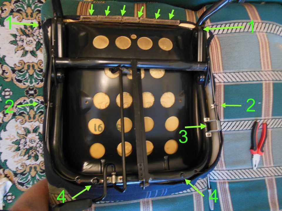 - Крепление кресла — четыре гайки, которые удерживают всю конструкцию на кронштейне. Откручиваете их, часть конструкции должна теперь «ходить» свободно.