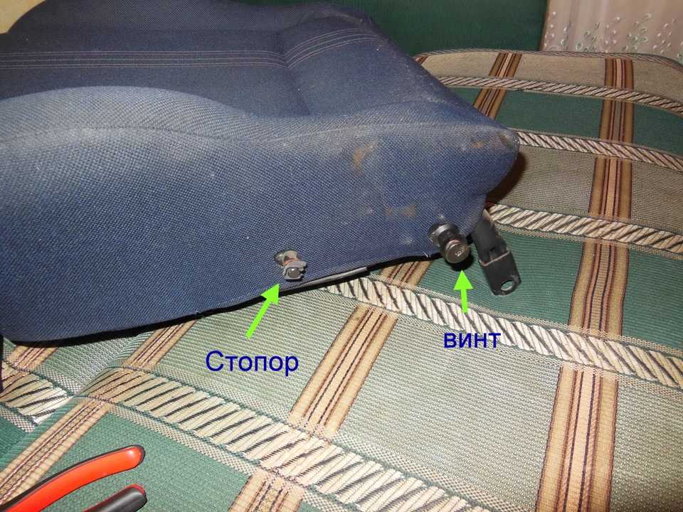 Принимаемся разбирать. С обеих сторон выкручиваем винты крепления спинки и сиденья, и снимаем стопоры.
