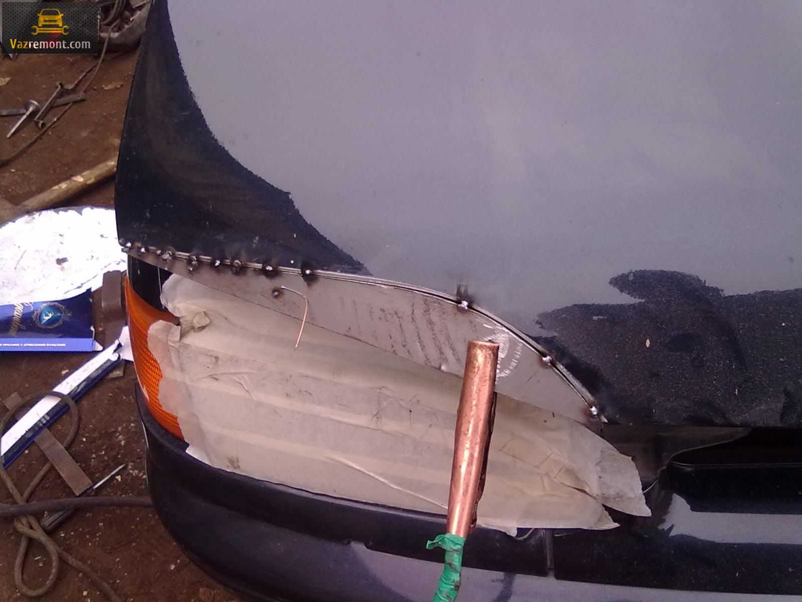 СОВЕТ: Наваривать лучше всего только снаружи ибо в дальнейшем у вас могут быть проблемы при открытии капота в автомобиле.