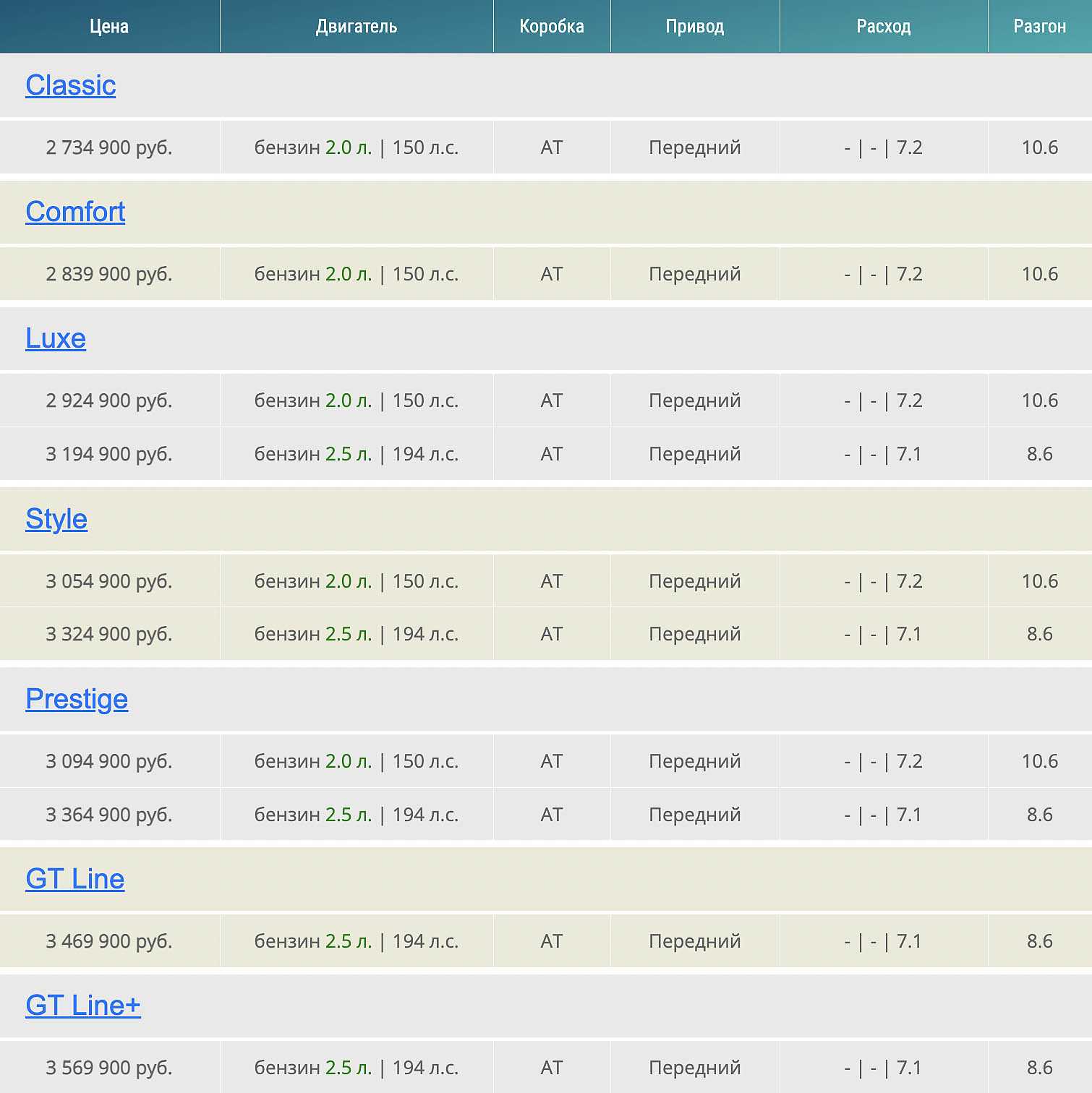 | 2,4 AT (188 л.с.) | GT Line | АИ-95 | Передний | 6,2 / 12 | 9,1 с | 210 км/ч |