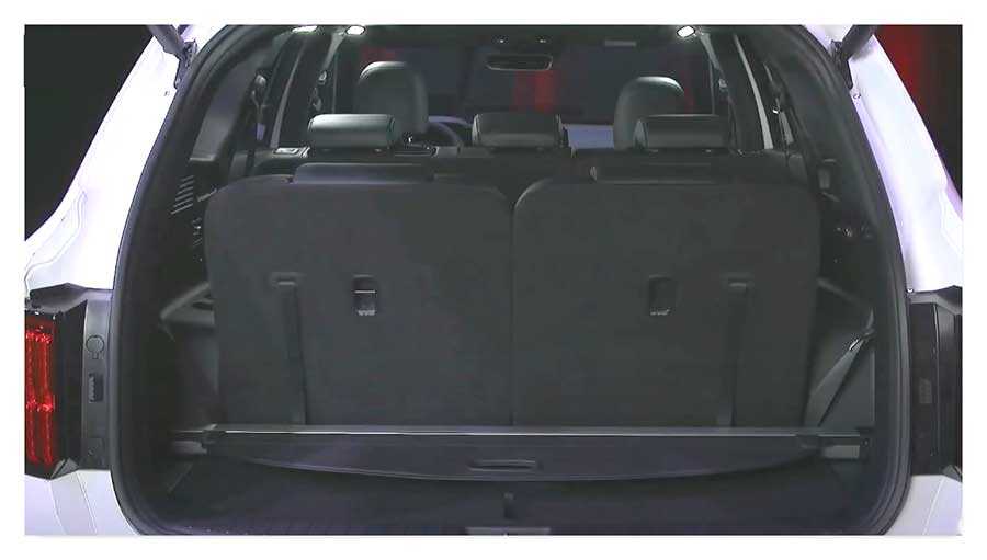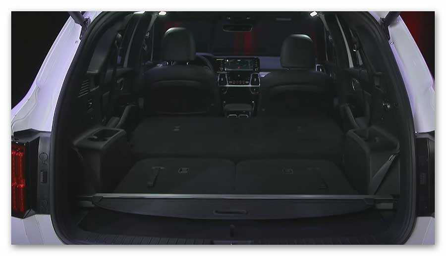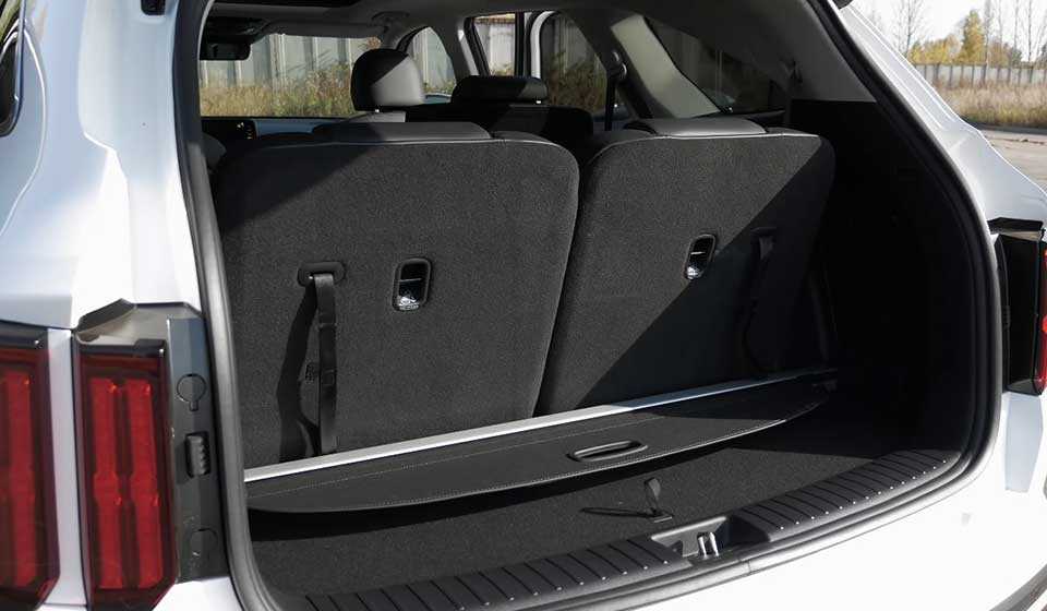Модель Sorento четвертого поколения наделяется достаточно емким багажником: при стандартном положении спинок сидений двухрядного салона его объем составляет максимально 910 л, а если автомобиль трехрядный, и последние два кресла сложены, то 821 литров (нужно учесть, что диван на салазках может двигаться продольно).