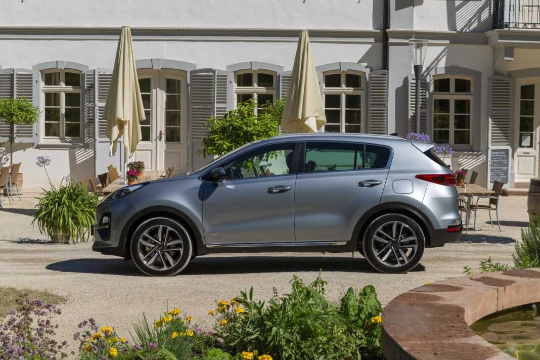 В профиль новинка выглядит как рядовой европейский кроссовер и чем-то примечательным похвастаться не может. По верхушке проходят хромированные рейлинги вплотную прилегая к кузову. Окна собраны в трапецию неправильной формы, разделены чёрными стойками и окаймлены серебристой вставкой. Стёкла достаточно крупные, поэтому с боковым обзором у КиаСпортажтакже проблем нет.