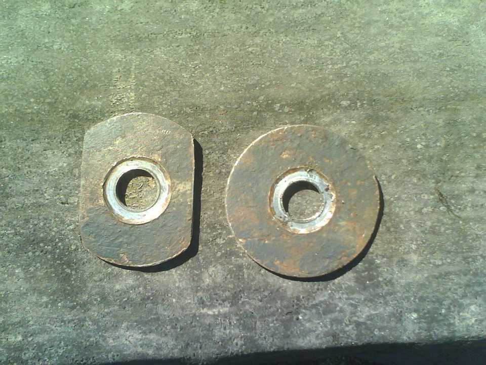 Затем долгий процесс отвинчивания крабов, со всей прелестью закисших за столько лет гаек(Те что на рычагах отвинчивал при помощи полутораметровой трубы, так что запаситесь прочными ключами. усилия там хорошие). Затем примерили балку, собтсвенно для ее установки из за конструктивных особенностей придаем передним шайбам вот такую форму: