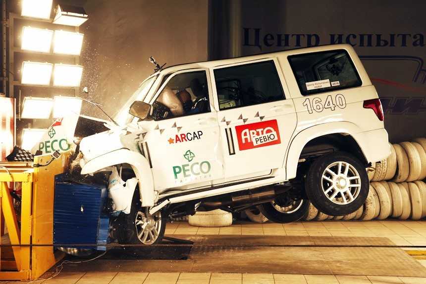 По результатам краш-теста по программе ARCAP УАЗ Патриот тестировался на лобовое столкновение при скорости 65 км/ч. Кузов удар выдержал и не сорвался с рамы, как это было в случае с Симбиром. Подушки безопасности сработали корректно, о чем свидетельствуют отпечатки от голов манекенов.