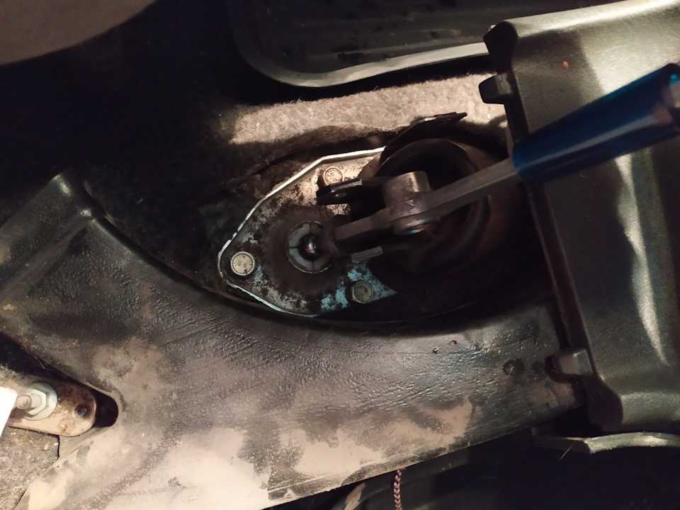 - Теперь можно залезть под машину и начинаем отвинчивать накидным на 13 крепеж вставки втулки в трубку-рычаг (еще называют кулиса), и вынимаем рычаг.