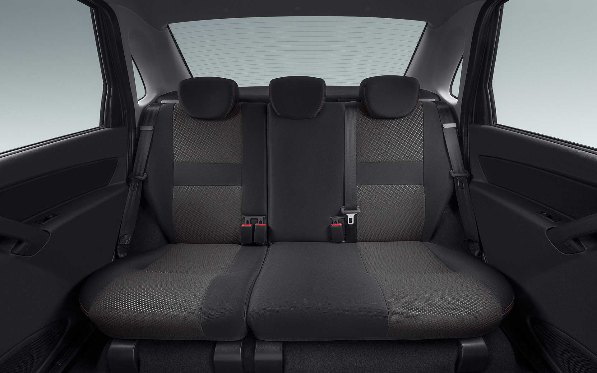 Передний ряд кресел выполнен в спортивном стиле с выраженной боковой поддержкой и регулируемым поясным упором. Вставки сделаны из искусственной замши − алькантары. Интерьер выполнен в черно-серой гамме с красными акцентами. Красная же подсветка присутствует на приборной панели, в ногах и на ручках дверей.