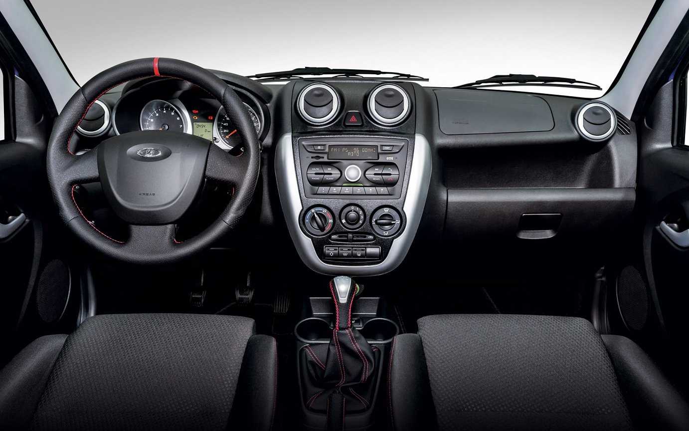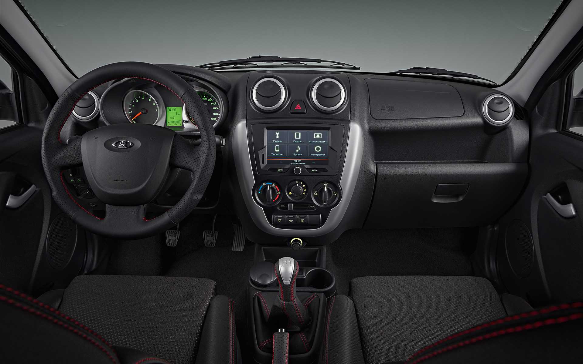 Характерными чертами салона новой версии Гранты являются обивка с красными вставками и такого же цвета прострочкой (контрастными швами украшены сиденья и руль), а также красная подсветка приборной панели. Еще один обязательный атрибут – это передние кресла с особым «анатомическим» профилем и рельефными валиками боковой поддержки.