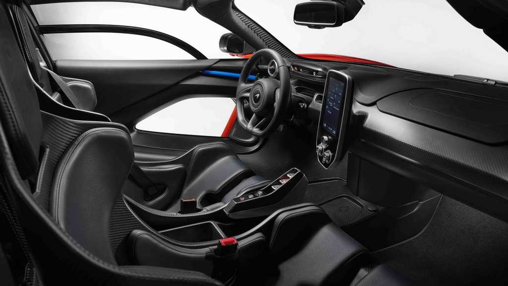 Сам салон — это Ода минимализму. Здесь все подчинено функционалу и предлагается самое необходимое. Это означает, что внутри будут установлены: суперлегкие сиденья с обивкой на выбор, такие элементы как дверные ручки, кнопка запуска двигателя и кнопки открывания окон были расположены на крыше. Трехспицевое рулевое колесо свободно от кнопок и переключателей, в то время как очень простой и узкий горизонтальный экран непосредственно перед водителем сообщает информацию об оборотах двигателя, выбранной передаче и скорости. Все остальные данные и настройки можно увидеть на экране высокой четкости McLaren Folding Driver Display и центральным экране информационно-развлекательной системы.