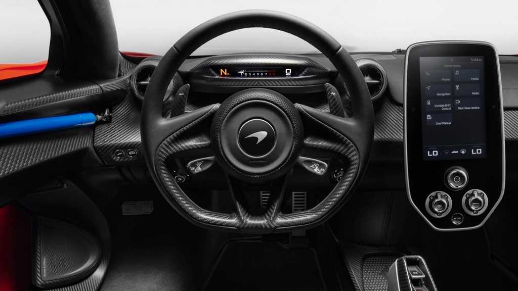 Трехспицевый руль новинки полностью лишен каких-либо клавиш управления. На потолке имеется кнопочный блок для открывания дверей, опускания стекол и запуска мотора. В качестве приборной панели используется складной дисплей McLaren Folding Driver Display, а управление настройками осуществляется через интерфейс бортовой информационно-развлекательной системы, экран которой закреплен на центральной консоли.