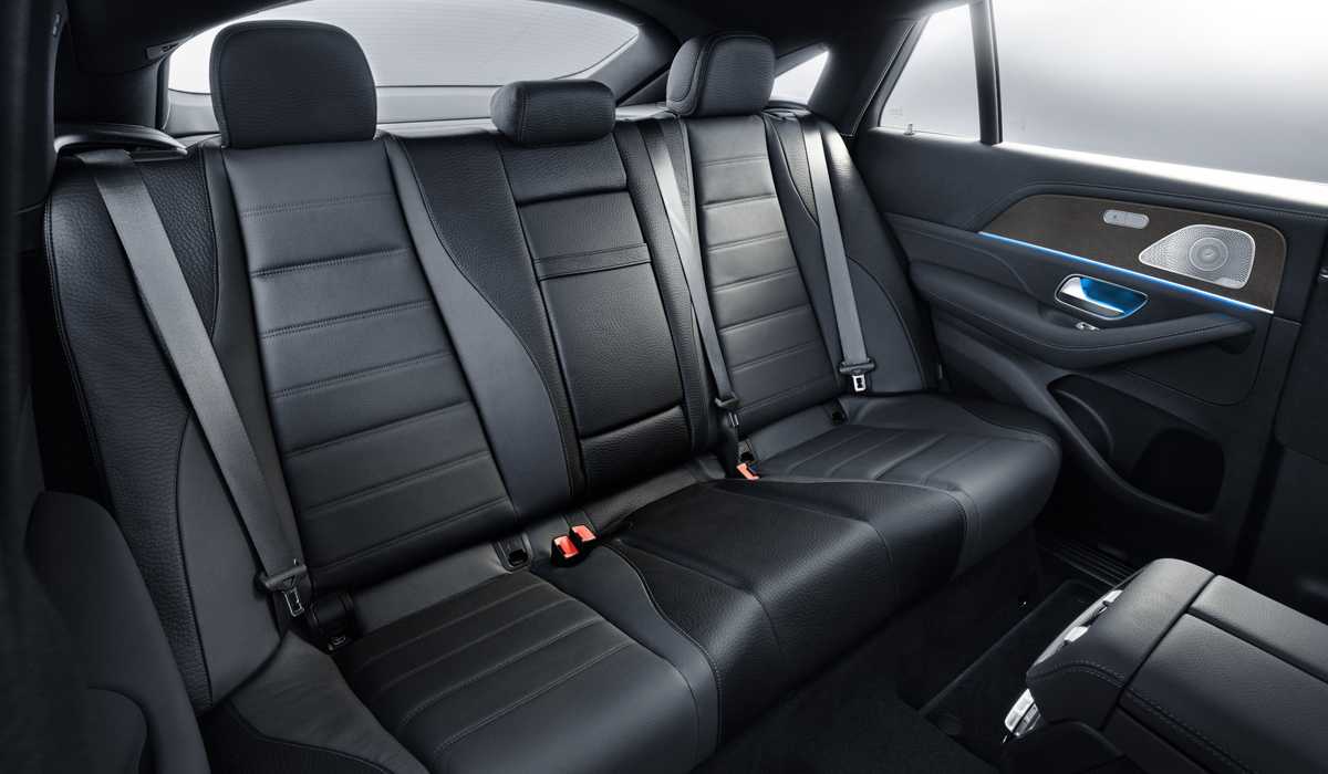 Оформлением интерьера купеобразный GLE почти не отличается от «полноценного». Разве что уже в базовой комплектации установлены спортивные сиденья, а передняя панель имеет отделку из искусственной кожи (для обычного GLE это опции). Широкий сплошной щиток вмещает дисплеи приборов и медиасистемы MBUX, оба диагональю 12,3 дюйма. Задний ряд рассчитан на троих пассажиров, а его спинка разделена в пропорции 40:20:40.
