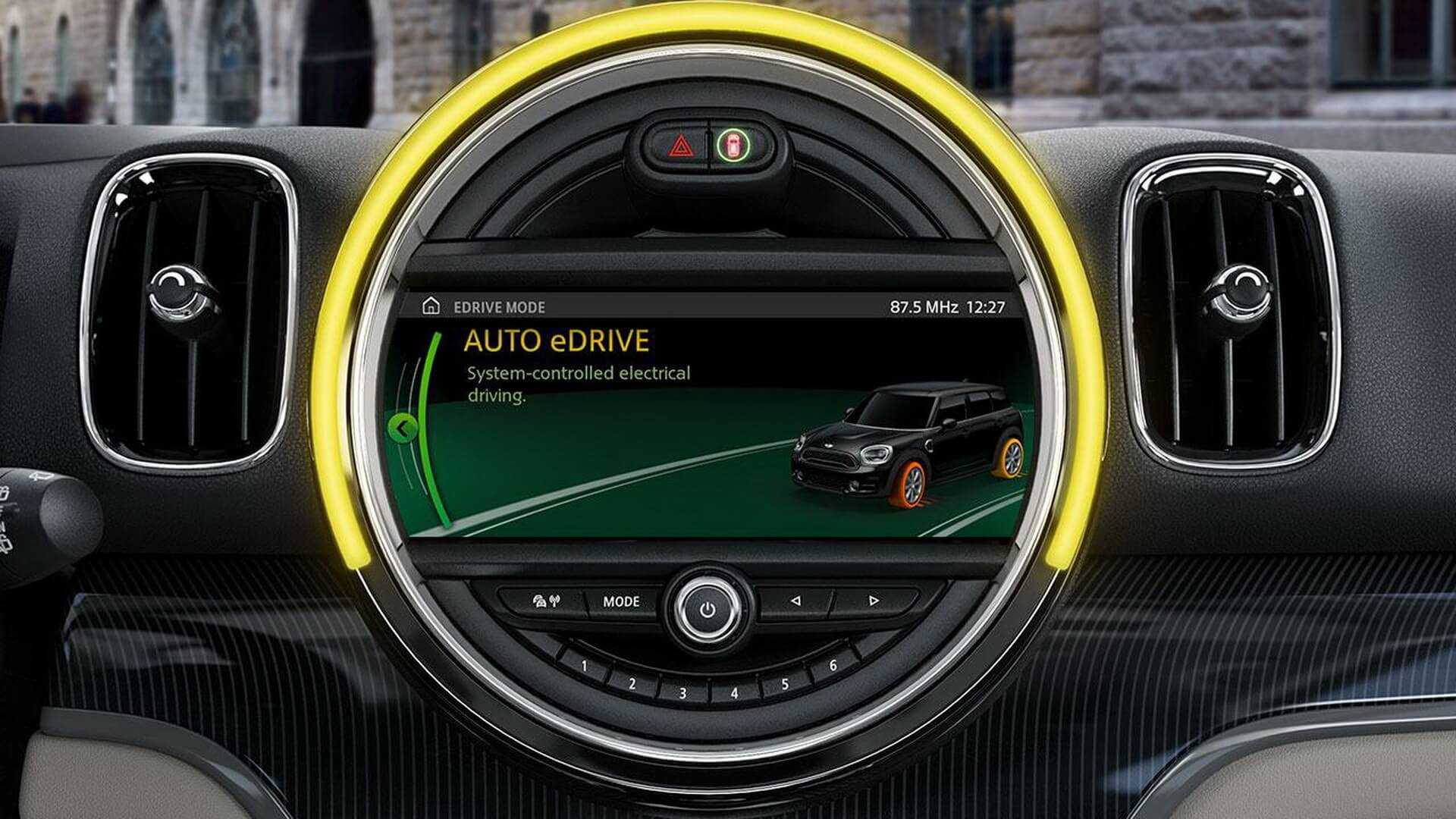Одним из тумблеров включается спортивный режим, правда, в этом случае мини купер кантримен технические характеристики меняет незначительно. Действие заключается в дополнительном раскручивании оборотов двигателя. Мультимедиа-система, находящаяся внутри огромного спидометра, управляется джойстиком, нужно отметить, весьма неудобно. В привычном для любого водителя месте на панели приборов располагается лишь тахометр.