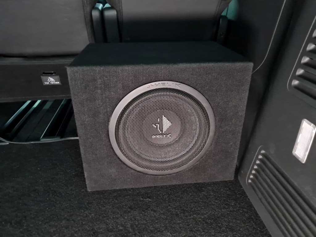 Общий вид багажника с сабвуфером калибром в 10 дюймов. На сабвуфере установлен оригинальный гриль от компании Helix.