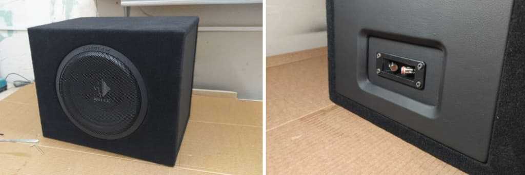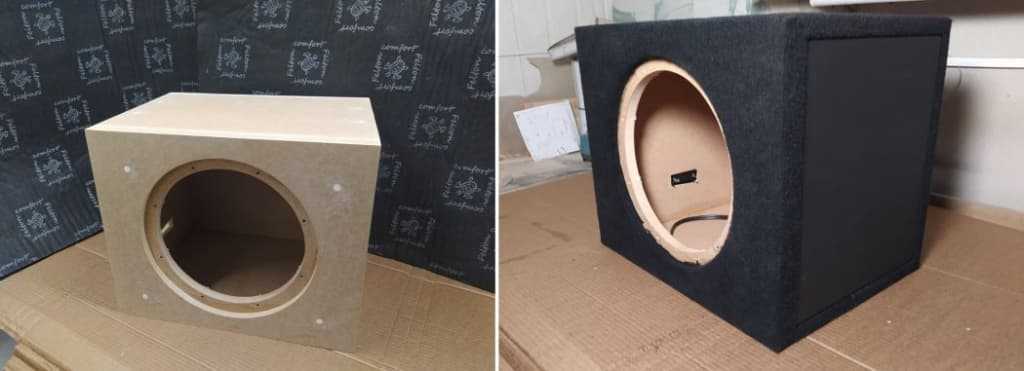 Собранный корпус проверяем на герметичность и перетягиваем в карпет черного цвета. Одновременно перетягиваем декоративные боковины в биэластик. Устанавливаем динамик с грилем и панельку в контактными разъемами для подводящих акустических проводов. Если нужно снять сабвуфер для перевозки крупногабаритного груза, то это легко сделать, разъемы просто отсоединяются.