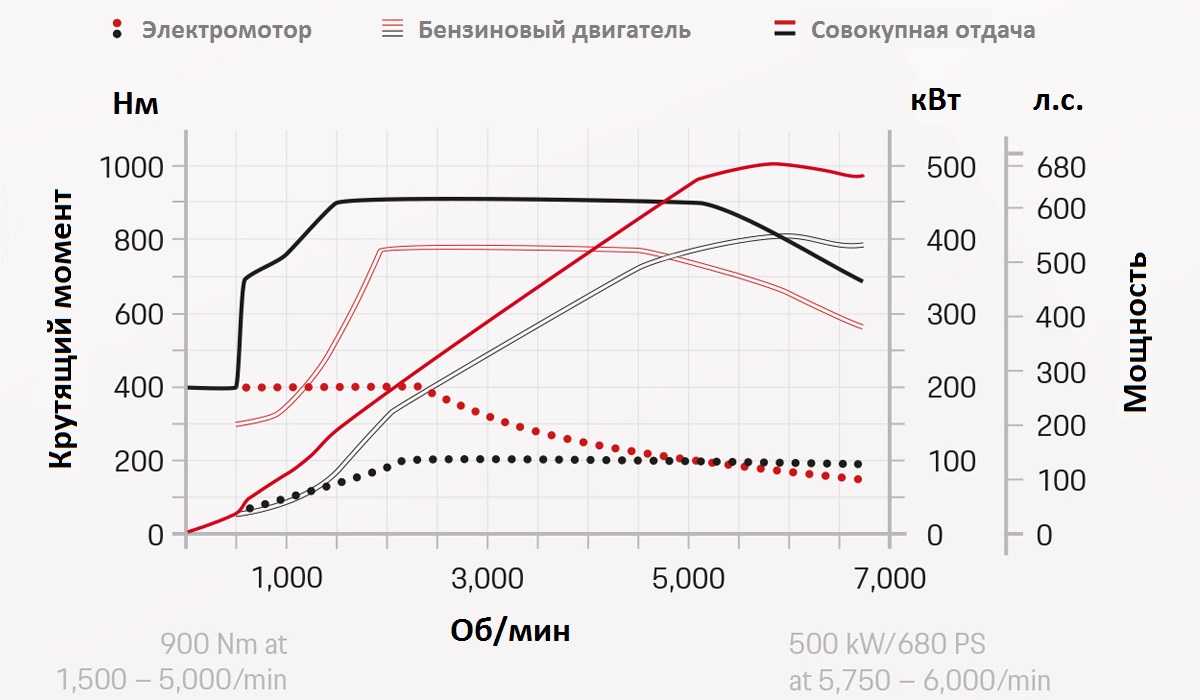 - крутящий момент (максимальный) общий – 590Нм (1250-4000 об/мин.), для ДСВ — 440 Нм (3000-5250), для электрического мотора – 310 Нм (1700);