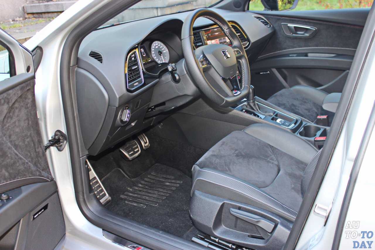 В интерьере использованы карбоноподобные материалы и много алькантары. Тот, что на сиденьях, также доступен в обычной Cupra, но R также можно найти на рулевом колесе. Вроде мелочь, но сразу настраивает на более спортивный лад. Руль отлично лежит в руках и не будет скользить, даже если руки начнут потеть при жесткой езде.