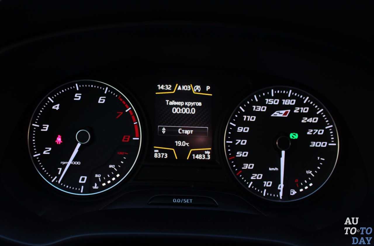 Рулевое колесо со срезанным нижним сектором в зоне правильного хвата обшита перфорированной кожей, так что руки не потеют даже, когда весь сосредоточен и не можешь оторваться от дороги. За рулем хорошо читаются приборы – спидометр, размеченный до 300 км/ч, и тахометр. Между ними – цветной дисплей бортового компьютера, знакомый нам по другим моделям концерна (к примеру, с ним мы знакомились на кроссовере SEAT Ateca). Но меню имеет свой, особенный раздел – встроенный счетчик пройденных кругов. Как же жаль, что в нашей стране нет трека, на котором можно было бы «продернуть» за определенную сумму на своем авто. Глядишь, тогда и на дорогах общего пользования ездить было бы не так страшно.