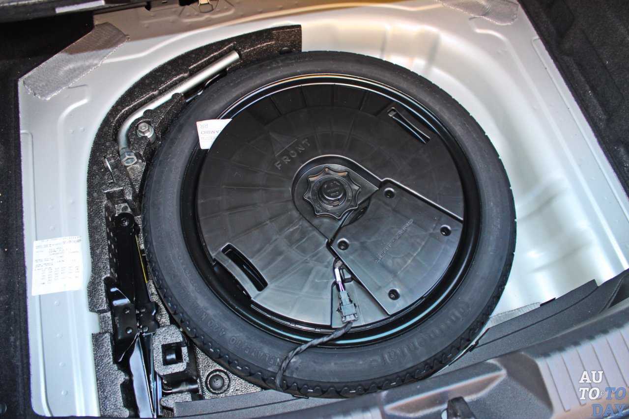 Для запасного колеса предусмотрена ниша, которая закрывается съемной раскладывающейся фальшпанелью, но, к сожалению, «полик» не фиксируется в открытом положении.