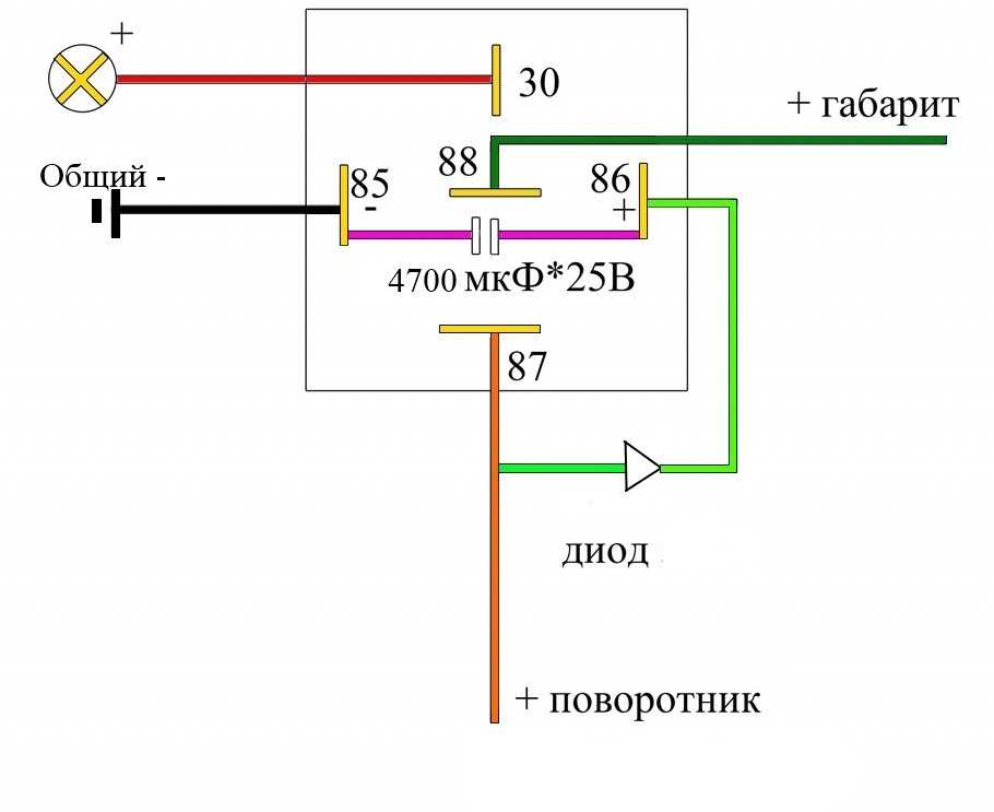На саму лампочку (к патрону в фаре) пойдут: — от 85 и + от 30Приходящие на колодку:От поворотника: — к 85, + к 87От габарита: — (не обязательно делать два минуса, можно либо с поворотника, либо с габарита взять, но если что его тоже к 85), + к 88Конденсатор: — к 85 (серой полоской), + к 86Диод: — к 86 (серой полоской), + к 87.