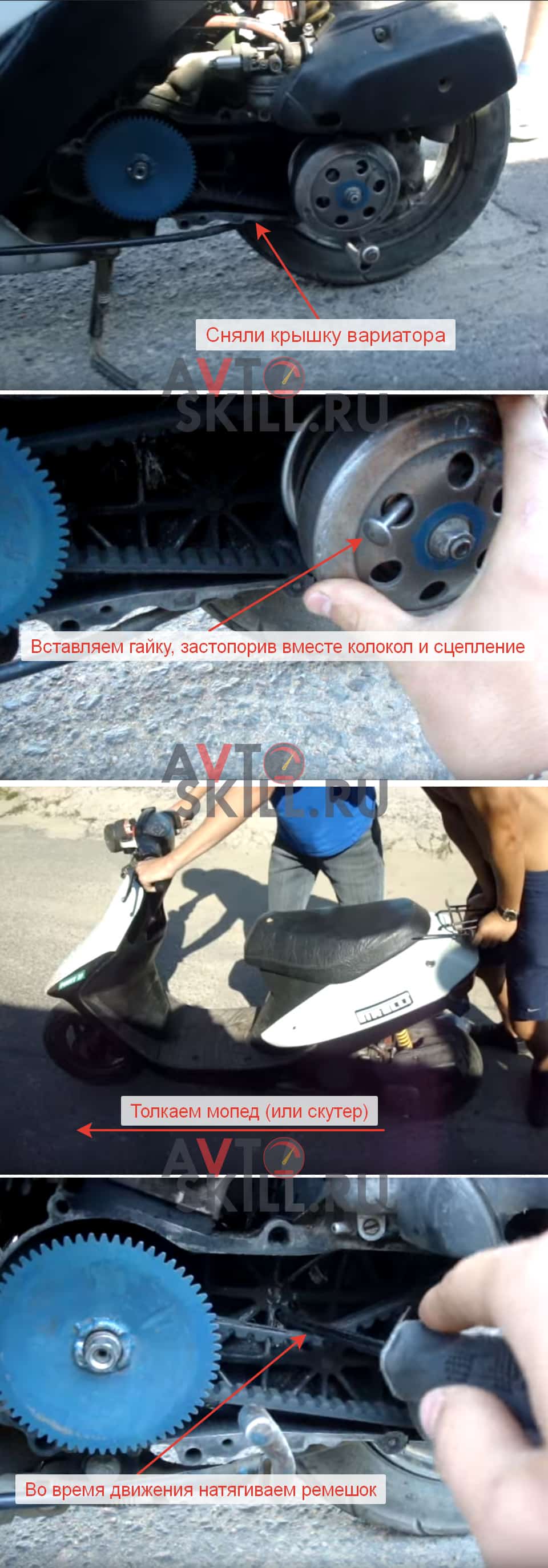 Чтобы данный метод сработал, необходимо добраться до колокола сцепления, для этого аккуратно снимите защитную крышку вариатора. Далее от нас потребуется застопорить друг с другом колокол и сцепление. Делается это следующим образом: возьмите гайку от защитной крышки вариатора, а потом вставьте его с усилием, чтобы она там зафиксировалась. Для осуществления этого способа обязательно понадобится помощник. Он будет толкать мопед, а вы в нужное время при разгоне должны надавить на ремешок вариатора, так вам удастся провернуть колесо. Когда двигатель заведется, гайка выпадет на землю сама собой, так что вы ее не потеряете — об этом не нужно беспокоиться.
