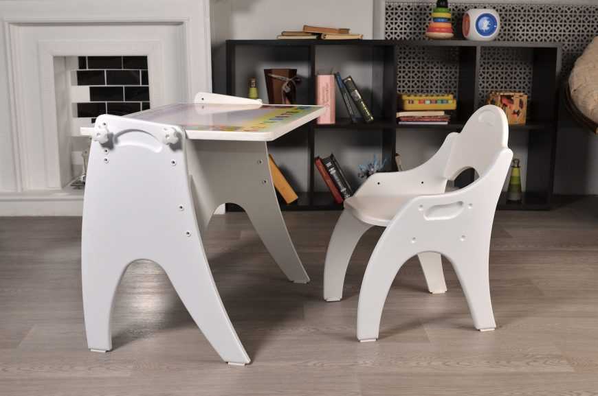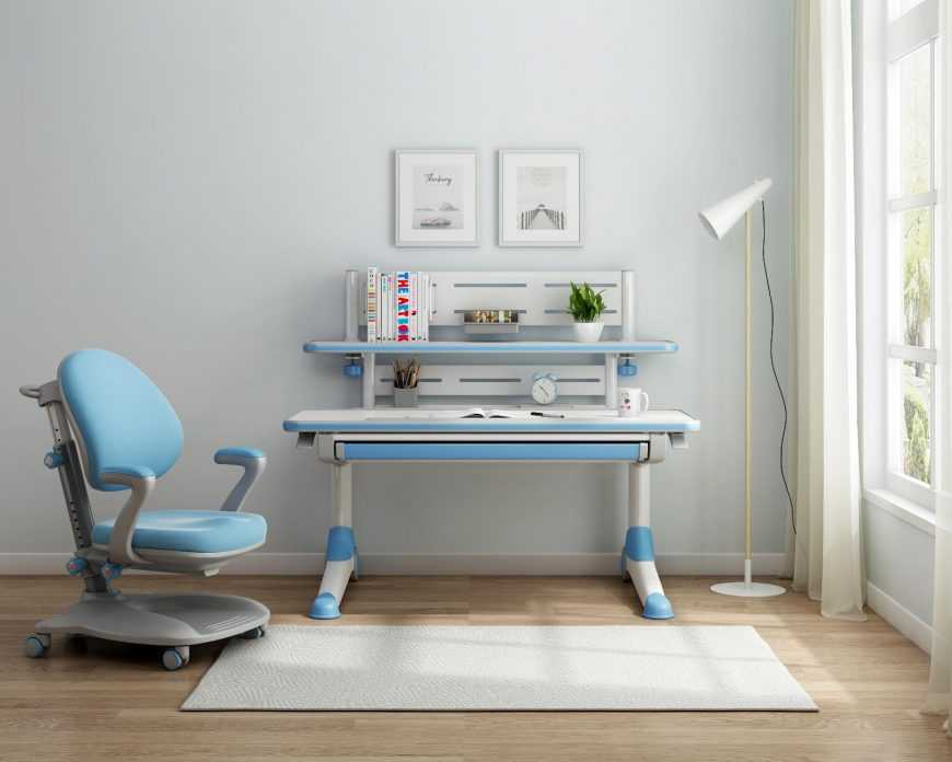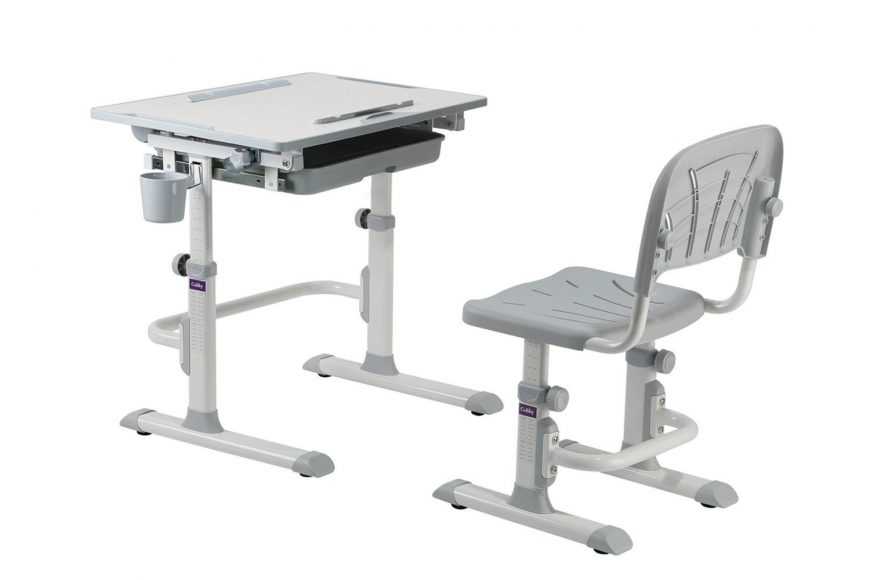 Есть выдвижной органайзер-пенал, а также специальные выемки для карандашей и книг. В комплекте с изделием также идет стул. Особое покрытие надежно защищает глаза ученика, а скругление углов – от случайных травм.