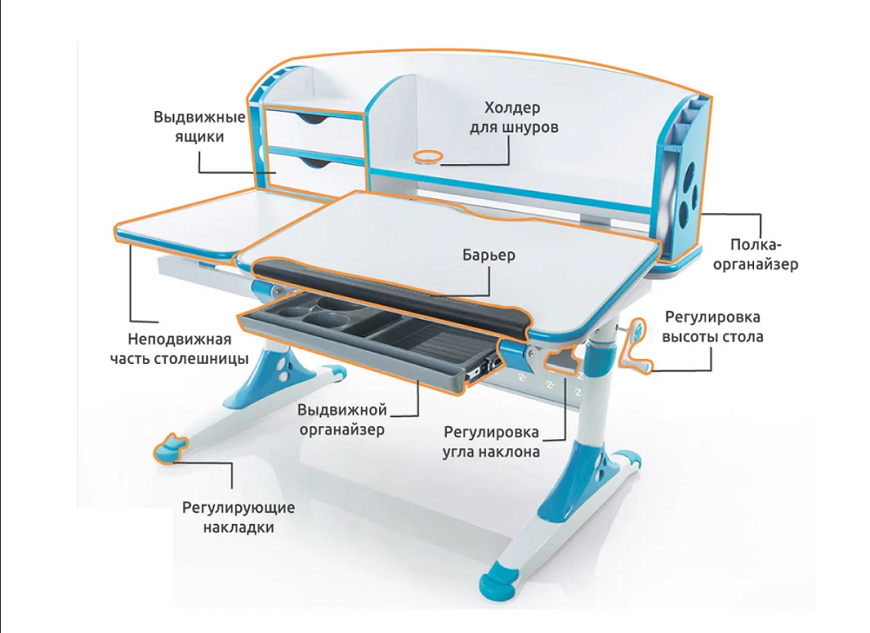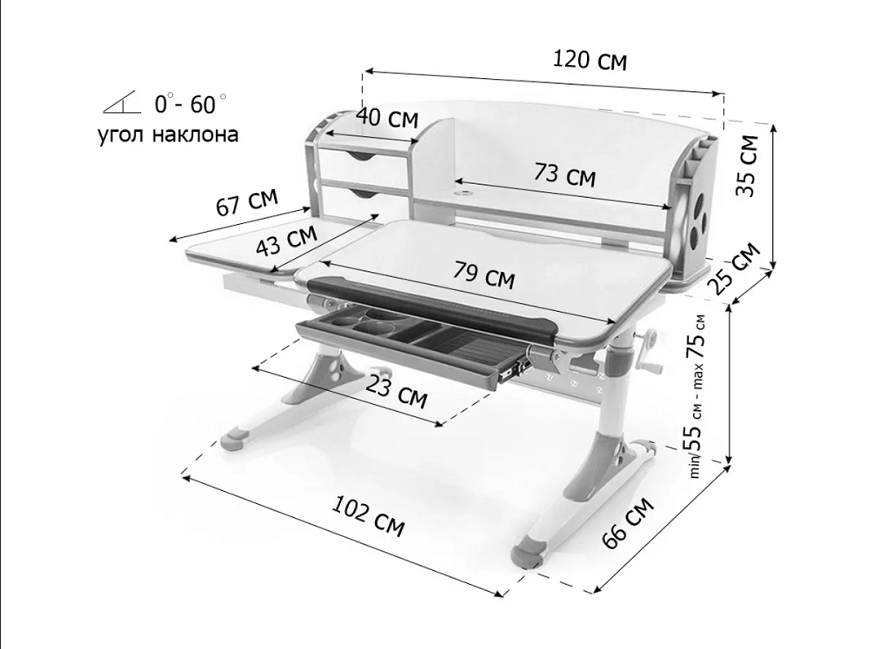 Высоту можно настраивать посредством простого механизма. Он поднимает изделие с 58 до 83 см. Столешница тоже регулируемая. Вдобавок, есть выдвижной пенал для предметов канцелярии и специальный барьер от скольжения.