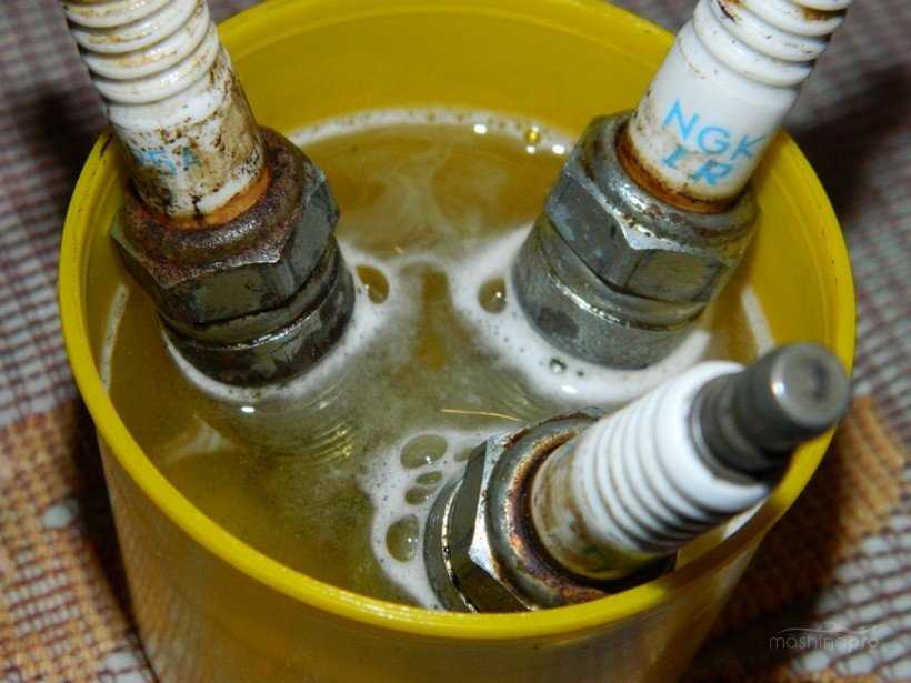 - Свечи оставляют в жидкости на 30-50 минут, все зависит от степени их загрязнения. Проходящая химическая реакция начнет удалять нагар.