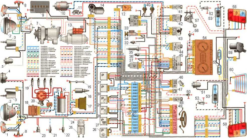 1. Передние фонари.2. Боковые указатели поворота.3. Электродвигатель омывателя ветрового стекла.4. Электродвигатель омывателя фар*.5. Коммутатор.6. Аккумуляторная батарея.7. Стартер ВАЗ-21213.8. Генератор.9. Фары.10. Моторедукторы очистителей фар*.11. Звуковой сигнал.12. Свечи зажигания.13. Концевой выключатель карбюратора.14. Электромагнитный клапан карбюратора.15. Катушка зажигания.16. Моторедуктор очистителя ветрового стекла.17. Блок управления электромагнитным клапаном карбюратора.18. Датчик-распределитель зажигания.19. Датчик указателя температуры охлаждающей жидкости.20. Датчик указателя недостаточного давления масла.21. Штепсельная розетка переносной лампы**.22. Датчик сигнализатора недостаточного уровня тормозной жидкости.23. Реле-прерыватель очистителя ветрового стекла.24. Реле включения ламп заднего противотуманного света***.25. Реле включения элемента обогрева заднего стекла.26. Реле включения очистителей и омывателя фар*.27. Реле включения ближнего света фар.28. Реле включения дальнего света фар.30. Реле включения стартера.31. Реле-прерыватель аварийной сигнализации и указателей поворота.32. Электродвигатель отопителя.33. Добавочный резистор электродвигателя отопителя.34. Лампы подсветки рычагов управления отопителем.35. Выключатель ламп наружного освещения.36. Основной блок предохранителей.37. Дополнительный блок предохранителей.38. Выключатель фонаря заднего хода.39. Выключатель стоп-сигнала.40. Регулятор ламп освещения приборов.41. Выключатель зажигания.42. Трехрычажный переключатель.43. Выключатель аварийной сигнализации.44. Выключатель очистителей и омывателей фар.45. Переключатель электродвигателя отопителя.46. Выключатель элемента обогрева заднего стекла.47. Выключатель ламп заднего противотуманного света.48. Выключатели плафонов, расположенные в стойках дверей.49. Плафоны освещения салона.50. Прикуриватель ВАЗ-21213.51. Выключатель лампы сигнализатора прикрытия воздушной заслонки карбюратора.52. Лампа сигнализатора прикрытия воздушной заслонки карбюратора.53. Выключатель лампы сигнализатора включения блокировки дифференциала.54. Выключатель лампы сигнализатора включения стояночного тормоза.55. Датчик указателя уровня и резерва топлива.56. Комбинация приборов.57. Электродвигатель омывателя заднего стекла.58. Задние фонари.59. Колодка для подключения дополнительных стоп-сигналов.60. Колодки для подключения боковых указателей габарита.61. Колодки для подключения к элементу обогрева заднего стекла.62. Фонари освещения номерного знака.63. Моторедуктор очистителя заднего стекла.