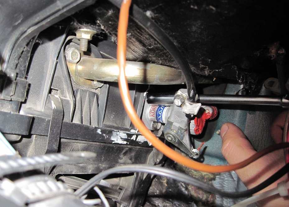 Расположение крана отопителя таково, что для его снятие нужно действовать как в салоне автомобиля, так и под ним. Сам краник скрывается около радиатора печки и виден после снятия боковой декоративной накладки панели со стороны водителя.