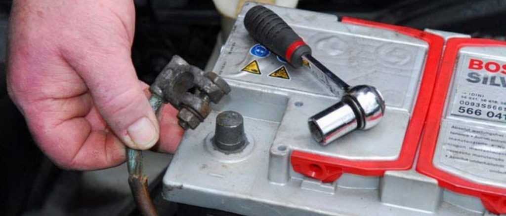 Отключаем минусовую клейму с АКБ, так как работы производятся с воспламеняемыми веществами (бензином) и электроприборами автомобиля.