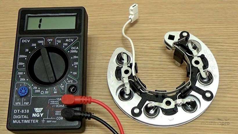 Перед проверкой моста нужно отключить все провода, идущие от него и от регулятора напряжения. Также заранее нужно убрать якорь «массы» с АКБ. Сначала нужно проверить выпрямитель на предмет короткого замыкания. Активируем режим омметра на мультиметре и подключаем красный (положительный) щупчик к положительному контакту диодного моста, а отрицательный щуп — к поверхности корпуса самого генератора. Если выпрямитель полностью исправен, то показания измерительного устройства устремятся к бесконечности. В остальных случаях выпрямитель будет неработоспособным.