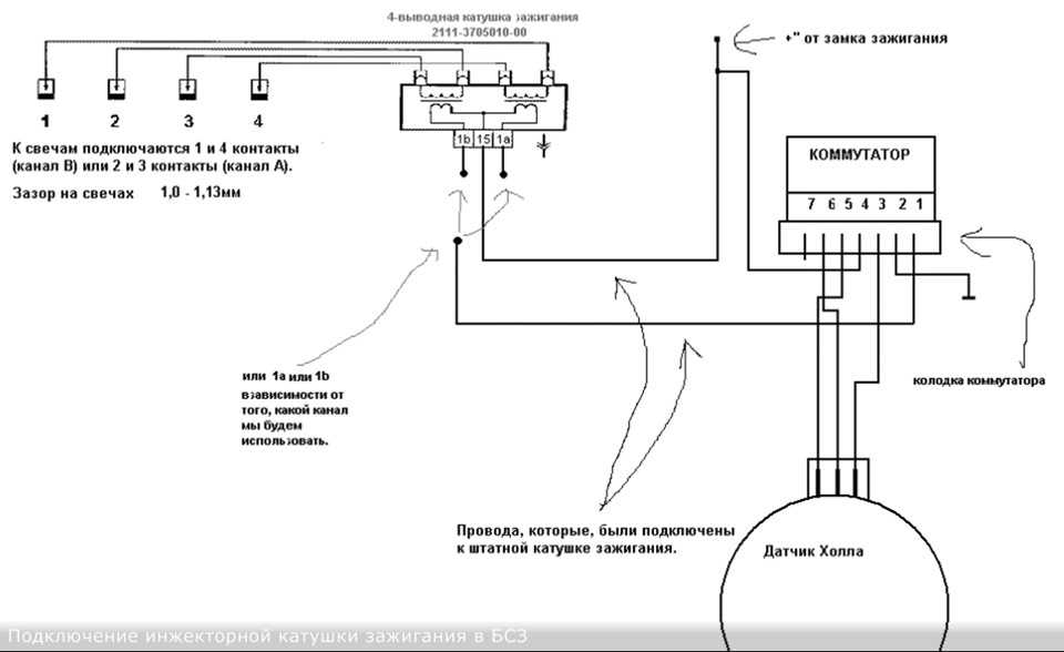 Сам центральный высоковольтный провод который идет на трамблер надо будет переделать, потому что вывод на катушке инжекторный значит тот конец провода который идет на катушку нужно установить инжекторный наконечник.На свечах рекомендуемый зазор 1,0 — 1,13 мм.Схема подключения инжекторной катушки: