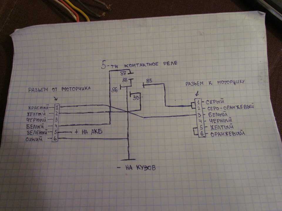 - 30 контакт реле – к желтому проводу моторчика