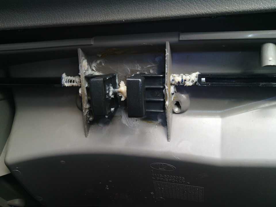 - Одной из причин посторонних звуков может быть недостаточно плотное прилегание демпферов бардачка к его крышке при закрытом состоянии. Из-за чего, во время движения автомобиля, она может скрипеть и дребезжать. На крышке нет регуляторов, поэтому не получится подкрутить резиновые демпферы.