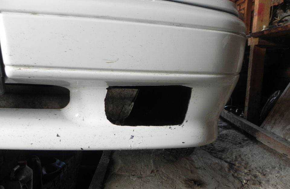 - Когда бампер будет снят, необходимо аккуратно вырезать отверстия в соответствующих местах под установку противотуманных фар. Лучше делать эту операцию, начиная с малого отверстия, постепенно подгоняя его под размер каждой фары (так удастся избежать образования щелей, через которые в ПТФ будет в дальнейшем проникать влага и пыль).