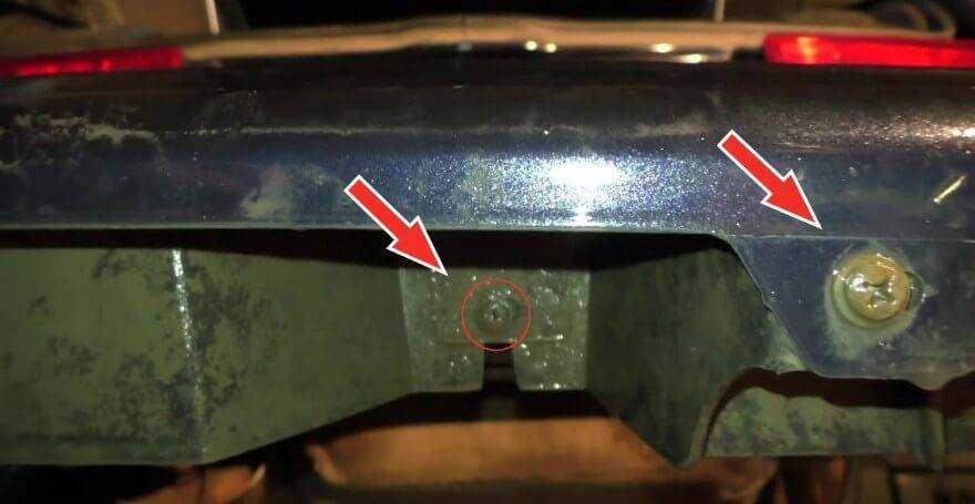 13. При необходимости разбираем бампер. Отвёрткой отворачиваем два винта крепления усилителя заднего бампера с одной стороны.
