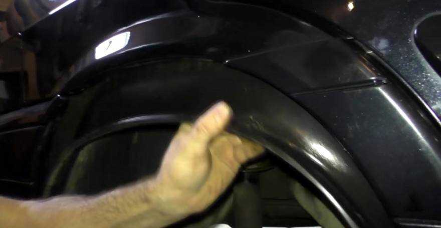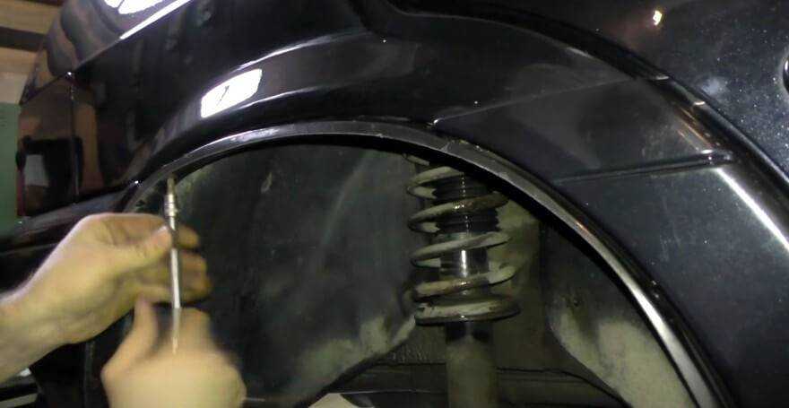 - Для начала откручиваем подкрылки. Обычно они закреплены на три самореза, но лучше смотрите внимательно, возможно, в вашем случае их будет больше.