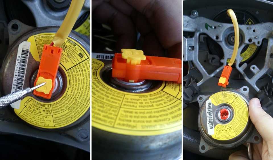 При демонтаже необходимо отсоединить фишки на подушке безопасности, отключить массу и провод сигнала