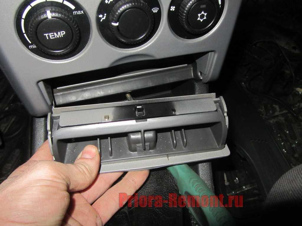 - Откройте отсек с пепельницей, аккуратно, но с усилием, тяните за ее края. Выньте пепельницу, отложите в сторону.