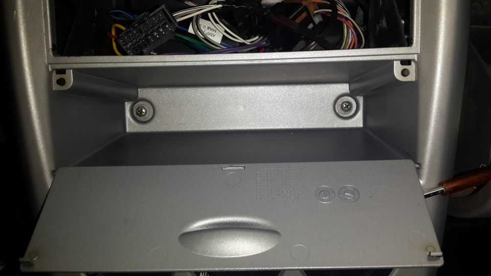 В данном случае мы имеем дело с уже вырезанной консолью под 2-din, поэтому двух оставшихся саморезов не видно, и лишь чуть ниже видны места крепления, которые когда-то там были. На фото выше они видны — немного в углублении. Если же у вас все находится в заводском виде, то выглядеть все будет следующим образом — пару саморезов находятся под крышкой:
