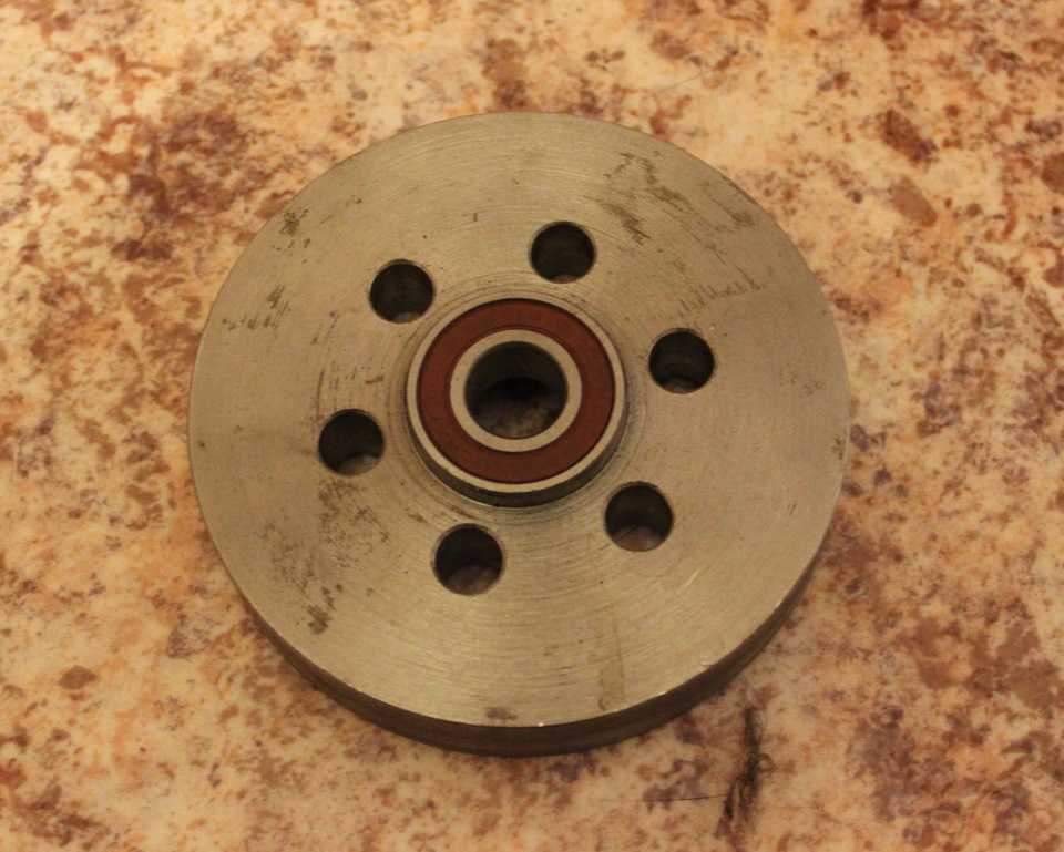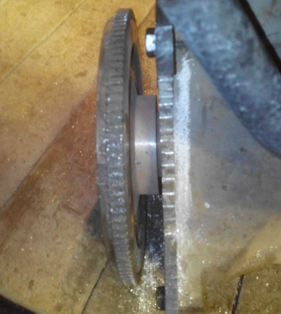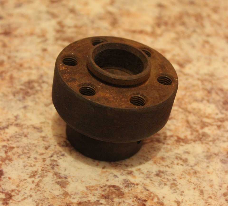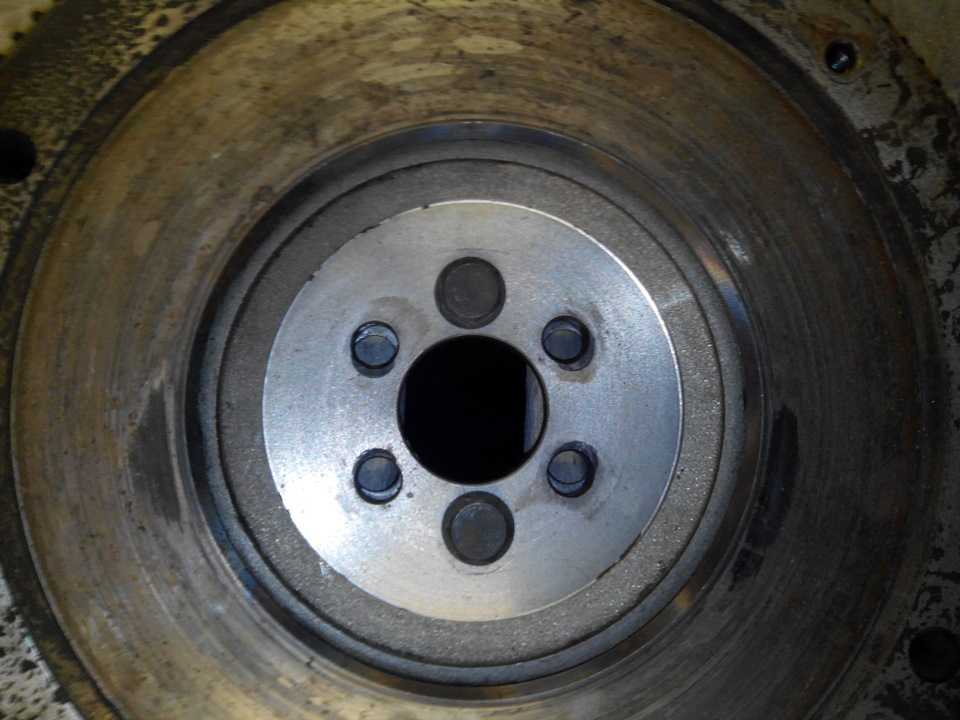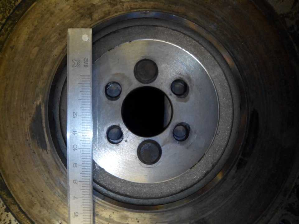и снял с него все размеры ( через тойотовскую упорную шайбу тоже можно, но получается менее точно). Далее необходимо определиться с толщиной шайбы: у ваза расстояние от привалочнй плоскости коробки до привалочной плоскости маховика порядка 25 мм, у тойоты 15 мм, т.к.переходную пластину я решил использовать толщиной 10 мм получаем 25+10-15 = 20мм собсно толщина нашей шайбы. Теперь с одной стороны делается отверстие под носок коленвала тойоты с другой под подшипник КВ ВАЗа и шесть отверстий под болты маховика. Получаем это: