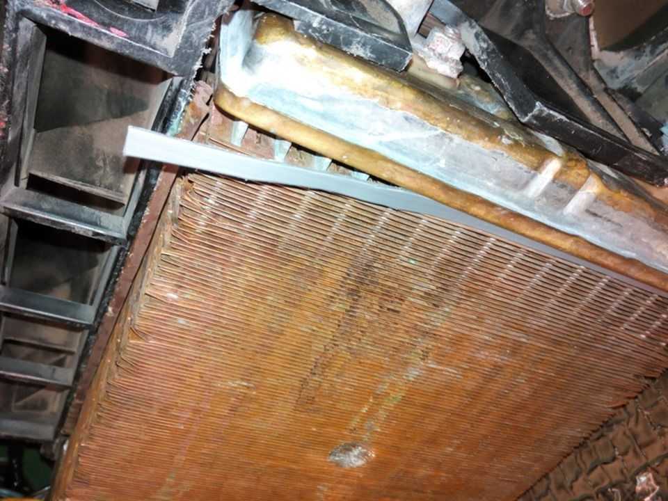 - Забит радиатор печки. Причин, по которым забит радиатор печки снаружи и внутри несколько. Снаружи он забивается через защитный кожух, в результате чего в радиатор печки попадают пыль, листья, насекомые и т.д. Изнутри радиатор забивается исключительно в процессе эксплуатации различной грязью и отложениями, которые присутствуют в системе охлаждения мотора, а также из-за использования некачественного антифриза.